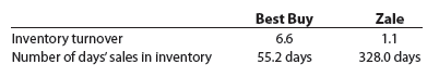 As with most financial ratios, differences exist among industries. To illustrate, Zale Corporation is a large retailer of fine jewelry in the United States. Since jewelry doesn’t sell as rapidly as Best Buy’s consumer electronics, Zale’s inventory turnover and number of days’ sales in inventory should be significantly different than Best Buy’s. For a recent year, this is confirmed as shown below.