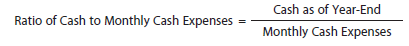 For startup companies or companies in financial distress, cash is critical for survival. In their first few years, startup companies often report losses and negative net cash flows from operations. Moreover, companies in financial distress can also report losses and negative cash flows from operations. In such cases, the ratio of cash to monthly cash expenses is useful for assessing how long a company can continue to operate without: