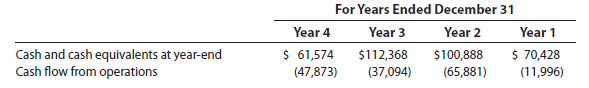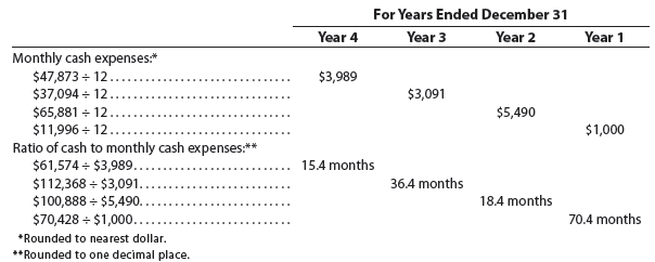 During Year 4, Evergreen’s monthly cash expenses increased from $3,091 to $3,989. As a result, Evergreen had 15.4 months of cash with which to continue to operate. Unless Evergreen can generate positive cash flows from operations, it will have to continue to raise cash from borrowing or issuing stock. In the long term, however, Evergreen cannot survive unless it generates positive cash flows from operations.