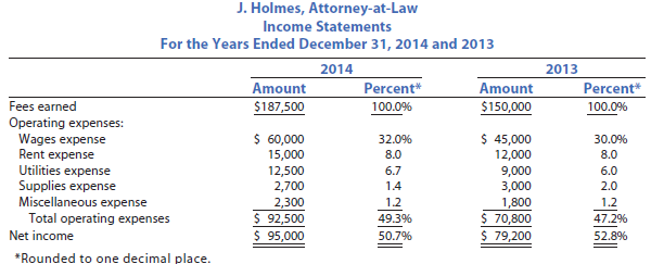 Vertical analysis is also useful for analyzing changes in financial statements over time. To illustrate, a vertical analysis of two years of income statements for J. Holmes, Attorney-at-Law, is shown below.