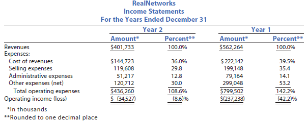 The preceding analysis indicates that RealNetworks experienced an operating loss of 8.6% of revenues in Year 2. The analysis indicates that the operating loss decreased significantly in Year 2 from a loss of 42.2% of revenues in Year 1. Each of the expenses as a percent of revenues decreased in Year 2. The largest decrease occurred in the Other expense (net) category, which decreased 23.2% (53.2% – 30.0%). An examination of RealNetworks’ annual report indicates that a large portion of the Other expense in Year 1 was caused by the loss of value of some of its long-term assets due to the depressed world economy in Year 1. Selling expenses decreased from 35.4% of revenues in Year 1 to 29.8% of revenues in Year 2; a 5.6% decrease. Cost of revenues decreased by 3.5% (39.5% – 36.0%) of revenues while Administrative expenses decreased by 1.3% (14.1% – 12.8%) of revenues.