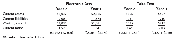 To illustrate, Electronic Arts has over three times more working capital ($1,031) than does Take-Two ($335). However, by using the current ratio the changes in liquidity of both companies can be directly compared. Specifically, Electronic Arts’ current ratio declined from 1.64 to 1.52, or 0.12. In contrast, Take-Two’s current ratio increased by 0.42 from 2.03 to 2.45. Thus, while Electronic Arts’ liquidity declined in Year 2, Take-Two’s short-term liquidity improved.