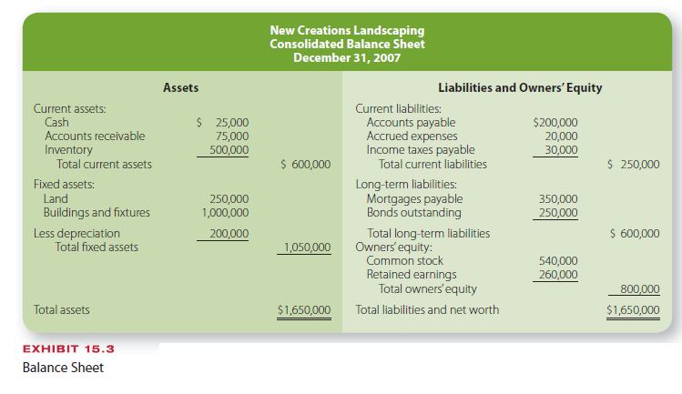 The balance sheet shows the firm’s financial position with respect to assets and liabili-ties at a specific point in time. An example of a balance sheet is presented in Exhibit 15.3. The balance sheet provides three types of information: assets, liabilities, and owners’ equity. Assets are what the company owns, and they include current assets (those that can be converted into cash in a short time period) and fixed assets (such as buildings and equipment that are long term in nature). Liabilities are the firm’s debts, including both current debt (obligations that will be paid by the company in the near future) and long-term debt (obliga- tions payable over a long period). Owners’ equity is the difference between assets and liabili- ties and is the company’s net worth in stock and retained earnings.