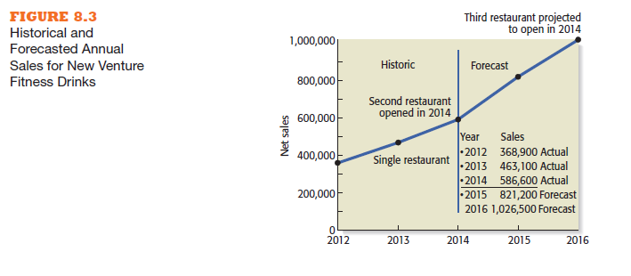 A sales forecast is a projection of a firm’s sales for a specified period (such as a year), though most firms forecast their sales for two to five years into the future.17 It is the first forecast developed and is the basis for most of the other forecasts.18 A sales forecast for an existing firm is based on (1) its record of past sales, (2) its current production capacity and product demand, and (3) any factor or factors that will affect its future production capacity and product de- mand. To demonstrate how a sales forecast works, Figure 8.3 is a graph of the past sales and the forecasted future sales for New Venture Fitness Drinks. The company’s sales increased at a rate of about 26 percent per year from 2012 to 2014 as the company became established and more people became aware of its brand. In forecasting its sales for 2015 and 2016, the company took into con- sideration the following factors: