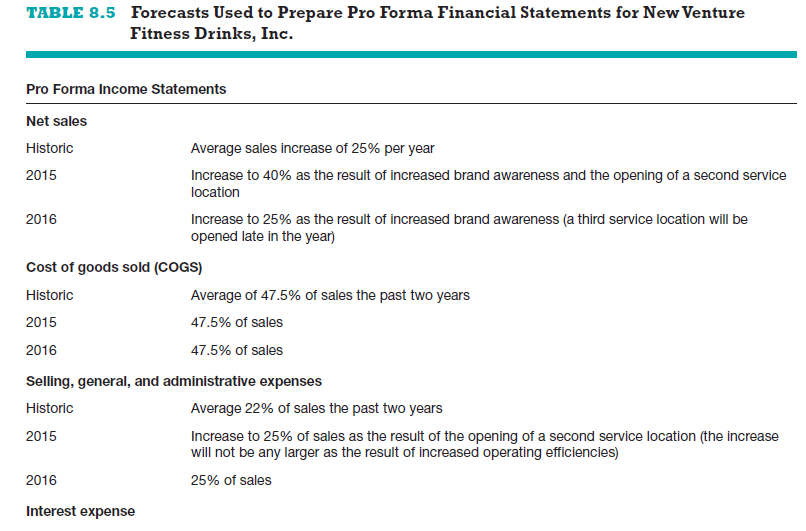 A summary of the forecasts used to prepare the pro forma financial state- ments for New Venture Fitness Drinks is provided in Table 8.5.
