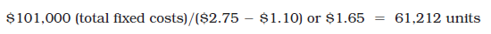 In addition to computing sales forecasts, when a company like New Venture Fitness Drinks considers opening a new restaurant or producing a new prod- uct, it often calculates a break-even analysis to determine if the proposed initiative is feasible. The break-even point for a new restaurant or product is the point where total revenue received equals total costs associated with the output of the restaurant or the sale of the product.21 In the case of opening a new restaurant, New Venture Fitness Drinks could use break-even analysis as one way of determining whether the proposed initiative is feasible. The formula for break-even analysis is as follows: Total fixed costs/(price – average variable costs). In most instances, average variable cost is the same number as average cost of goods sold. As a result, if the total fixed cost associated with opening a new restaurant is $101,000 per year, the average price for a fitness drink is $2.75, and the variable cost (or cost of goods sold) for each drink is $1.10, then the break-even point for the new restaurant is as follows: