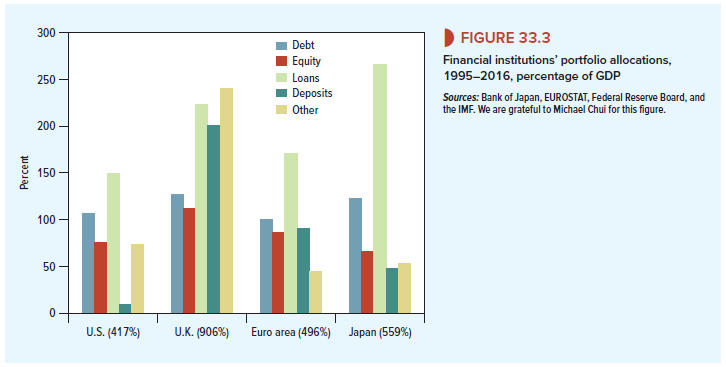 Now let’s look at financial institutions. Figure 33.3 shows the financial assets held by financial institutions, including banks, mutual funds, insurance companies, pension funds, and other intermediaries. These investments are smaller in the United States, relative to GDP, than in other countries (as expected in the U.S. market-based system). Financial institutions in the United Kingdom, Europe, and Japan have invested large sums in loans and in deposits. Holdings of equity are highest in the United Kingdom. These holdings are mainly owned by insurance companies and pension funds.