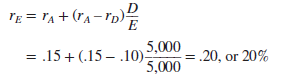 If the firm goes ahead with its plan to borrow, the expected return on assets rA is still 15%, but the expected return on equity is