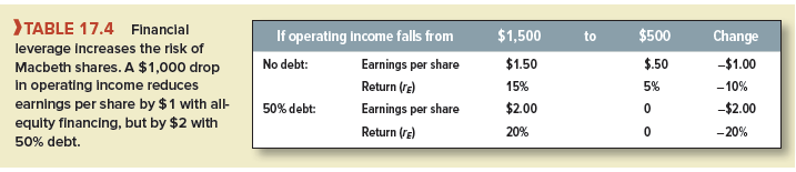 You can see financial risk at work in our Macbeth example. Compare the risk of earnings per share in Table 17.2 versus Table 17.1. Or look at Table 17.4, which shows how a shortfall in operating income affects the payoff to the shareholders. If the firm is all-equity-financed, a decline of $1,000 in the operating income reduces the return on the shares by 10 percentage points. If the firm issues risk-free debt with a fixed interest payment of $500 a year, then a decline of $1,000 in the operating income reduces the return on the shares by 20 percentage points. In other words, the effect of the proposed leverage is to double the amplitude of the swings in Macbeth’s shares. Whatever the beta of the firm’s shares before the refinancing, it would be twice as high afterward.
