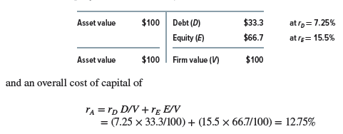 The change in financial structure does not affect the amount or risk of the cash flows on the total package of debt and equity. Therefore, if investors required a return of 12.75% on the total package before the refinancing, they must require a 12.75% return on the firm’s assets afterward.