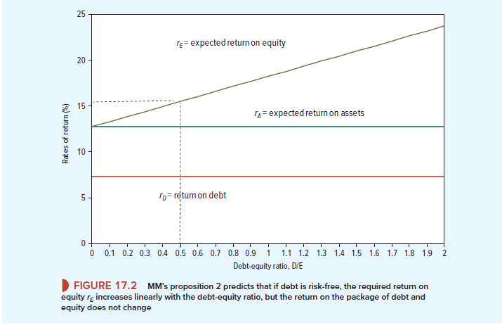 MM’s proposition 1 says that financial leverage has no effect on shareholders’ wealth. Proposition 2 says that the rate of return they can expect to receive on their shares increases as the firm’s debt-equity ratio increases. How can shareholders be indifferent to increased leverage when it increases expected return? The answer is that any increase in expected return is exactly offset by an increase in financial risk and therefore in shareholders’ required rate of return.