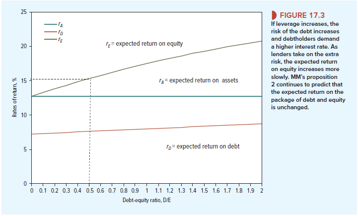 In Figure 17.2, we have drawn the rate of interest on the debt as constant no matter how much the firm borrows. This is not wholly realistic. It is true that most large, conservative companies could borrow a little more or less without noticeably affecting the interest rate that they pay. But at higher debt levels, lenders become concerned that they may not get their money back, and they demand higher rates of interest to compensate. Figure 17.3 modifies Figure 17.2 to account for this. You can see that as the firm borrows more, the risk of the debt slowly increases. Proposition 2 continues to predict that the expected return on the package of debt and equity does not change. However, the slope of the rE line now tapers off as D/E increases. Why? Essentially because holders of risky debt begin to bear part of the firm’s operating risk. As the firm borrows more, more of that risk is transferred from stockholders to bondholders.