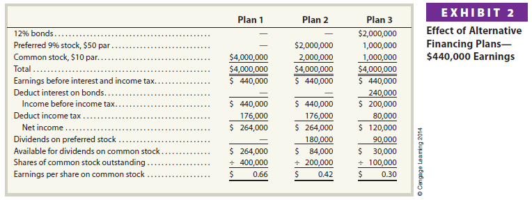 If smaller earnings occur, however, Plans 1 and 2 become more attractive to common stockholders. To illustrate, Exhibit 2 shows the effect on earnings per share if estimated earnings are $440,000 rather than $800,000 as estimated in Exhibit 1.