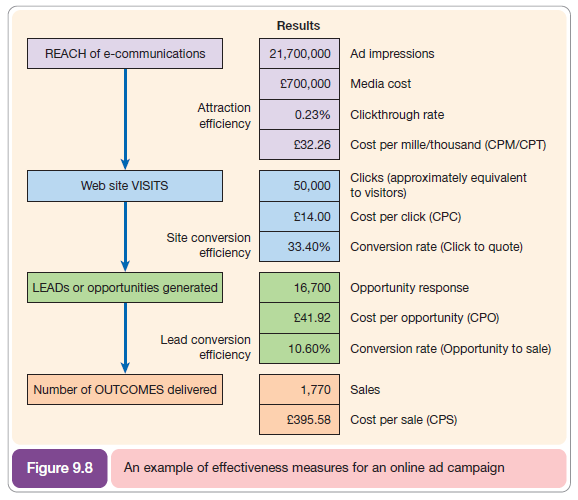 Figure 9.8 shows an example of effectiveness measures for an online ad campaign for an insurance product. Here an opportunity or lead is when a quote is requested. Note that the cost of acquisition is high, but this does not take into account the synergies of online advertising with offline campaigns, i.e. those who are influenced by the ad, but do not click through immediately.
