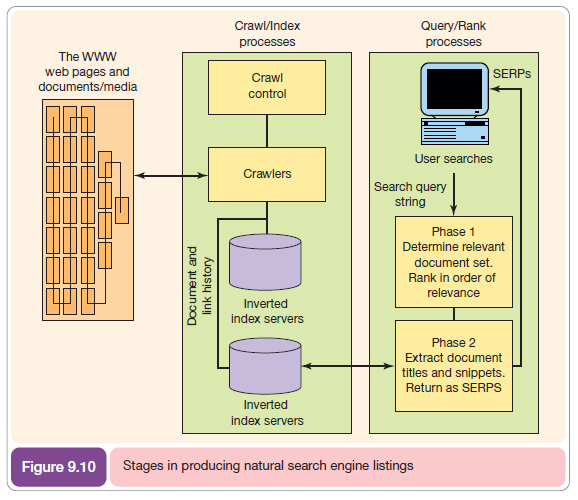 - Ranking or scoring. The indexing process has produced a lookup of all the pages that contain particular words in a query, but they are not sorted in terms of relevance. Ranking of the document to assess the most relevant set of documents to return in the SERPs (search engine results pages, Figure 9.9) occurs in real time for the search query entered. First, relevant documents will be retrieved from a run-time version of the index at a particular data centre, then a rank in the SERPs for each document will be computed based on many ranking factors of which we highlight the main ones in later sections.