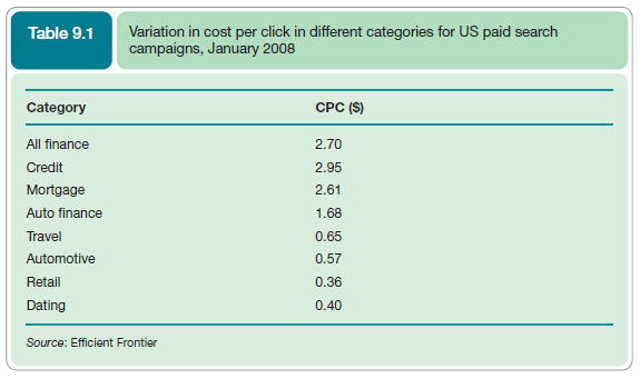 Paid search marketing or paid listings are similar to conventional advertising; here a relevant text ad with a link to a company page is displayed when the user of a search engine types in a specific phrase. A series of text ads usually labelled as ‘sponsored links’ are displayed on the right and/or above and below the natural search engine listings. Unlike conventional advertising, the advertiser doesn’t pay when the ad is displayed, but only when the ad is clicked on which then leads to a visit to the advertiser’s web site – hence this is often known as ‘pay-per- click marketing’! The relative ranking of these ‘paid performance placements’ is typically based on the highest bid cost-per-click value for each keyphrase. The variation in bid amounts for clients of one search bid management tool are shown in Table 9.1.