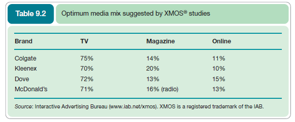 The mix between online and offline spend is varied to maximize campaign metrics such as reach, brand awareness and purchase intent. Table 9.2 summarizes the optimal mix identified for four famous brands. For example, Dove found that increasing the level of interactive advertising to 15% would have resulted in an increase in overall branding metrics of 8%. The proportion of online is small, but remember that many companies are spending less than 1% of their ad budgets online, meaning that offline frequency is too high and they may not be reaching many consumers.