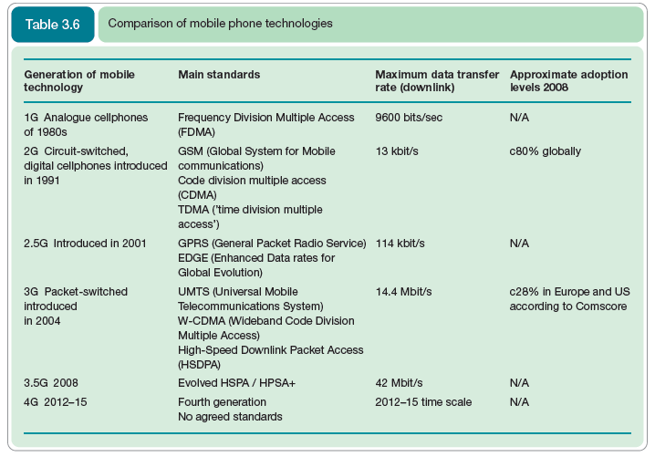 The capabilities of mobile phones have evolved tremendously since the first generation brick-like phones were introduced in the 1980s. There is a bewildering range of data transfer standards which are summarized in Table 3.6. Many subscribers are still using the second- generation GSM technology which does not permit Internet access, but many have the option for 2.5G web access via WAP. The 3G and 3.5G phones are sometimes known as video phones since they support video calls and broadband speed access