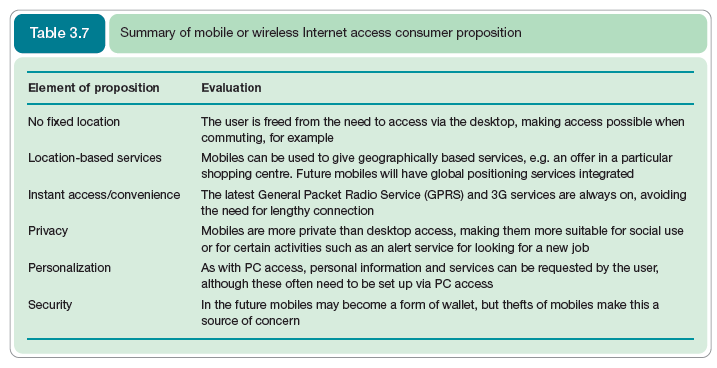 The benefits that mobile or wireless connections offer to their users are ubiquity (can be accessed from anywhere), reachability (their users can be reached when not in their normal location) and convenience (it is not necessary to have access to a power supply or fixed-line connection). In addition to these obvious benefits, there are additional benefits that are less obvious: they provide security – each user can be authenticated since each wireless device has a unique identification code; their location can be used to tailor content; and they provide a degree of privacy compared with a desktop PC – looking for jobs on a wireless device might be better than under the gaze of a boss. An additional advantage is that of instant access or being ‘always-on’; here there is no need to dial up a wireless connection. Table 3.7 provides a summary of the mobile or wireless Internet access proposition. There are considerable advantages in comparison to PC-based Internet access, but it is still limited by the display limitations such as small screen size and limited graphics.