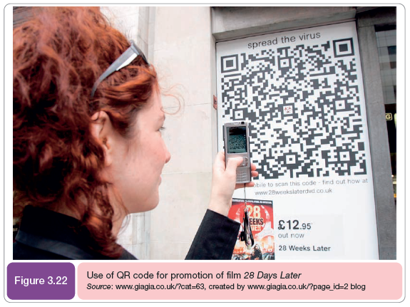 - Short codes. Short codes are easy to remember: 5-digit numbers combined with text that can be used by advertisers or broadcasters to encourage consumers to register their interest. A similar approach is Quick Response (QR) code which is a kind of barcode published in newspapers or billboards which can be scanned by a mobile phone camera and then linked directly through to a web site. It does require specific software. Figure 3.22 shows an example.