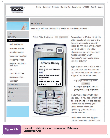 Mobile sites can also be made available through a .mobi domain where a WAP site is available for download of content. The example in Figure 3.24 shows a feed of news items repurposed for mobile.