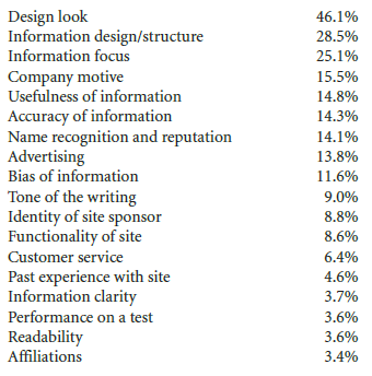 You can see that these authors suggest that simplicity in design is important. Another example of research into web site design factors supports the importance of design. Fogg et al. (2003) asked students to review sites to assess the credibility of different suppliers based on the web site design. They considered these factors most important:
