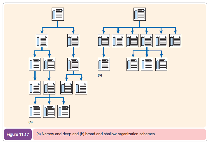 Most navigation systems are based upon a hierarchical site structure. When creating the structure, designers have to compromise between the two approaches shown in Figure 11.17. The narrow and deep approach has the benefit of fewer choices on each page, making it easier for the user to make their selection, but more clicks are required to reach a particular piece of information. The broad and shallow approach requires fewer clicks to reach the same piece of information, but the design of the screen potentially becomes cluttered. Figure 11.17(a) depicts the narrow and deep approach and Figure 11.17(b) the broad and shallow approach. Note that in these cases the approaches are appropriate for the non-technical and technical audiences respectively. A rule of thumb is that site designers should ensure it only takes three clicks to reach any piece of information on a site. This implies the use of a broad and shallow approach on most large sites. This may also be beneficial for SEO purposes. Lynch and Horton (1999) recommend a broad and shallow approach and note that designers should not conceive of a single home page where customers arrive on the site, but of different home pages according to different audience types. Each of the pages in the second row of Figure 11.15(b) could be thought of as an example of a home page which the visitors can bookmark if the page appeals to them. Nielsen (2000b) points out that many users will not arrive on the home page, but may be referred from another site or according to a print or TV advert to a particular page such as www.b2b.com/jancomp. He calls this process ‘deep linking’ and site designers should ensure that navigation and context are appropriate for users arriving on these pages.