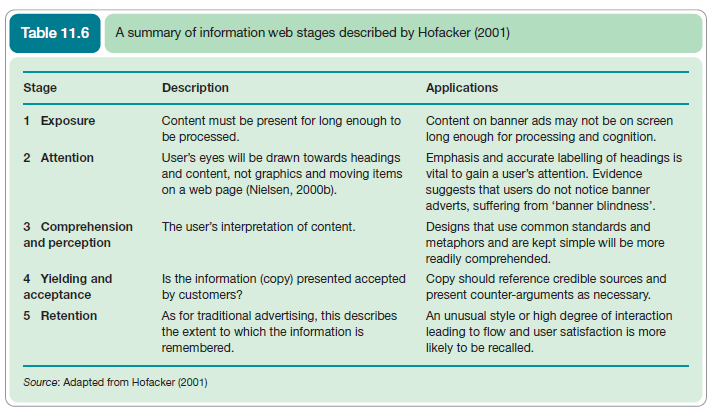 Hofacker (2001) describes five stages of human information processing when a web site is being used. These can be applied to both page design and content design to improve usability and help companies get their message across to consumers. Each of the five stages summarized in Table 11.6 acts as a hurdle, since if the site design or content is too difficult to process, the customer cannot progress to the next stage. It is useful to consider the stages in order to minimize the difficulties.