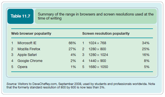 - Number of users of less popular browsers or variation in screen display resolution. Microsoft Internet Explorer is now the dominant browser, but there are less well known browsers which have a loyal following amongst the visually impaired (for example screen-readers and Lynx, a text-only browser) and early adopters (for example Mozilla Firefox, Safari and Opera). If a web site does not display well in these browsers, then you may lose these audiences. Complete Activity 11.5 to review how much access has varied since this book was published.