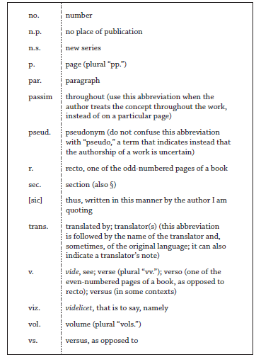 Abbreviations. Table 6.3 provides a list of common abbreviations. Specific subjects (paleography, classical and modern philology, logic, mathematics, etc.) have separate series of abbreviations that you will learn by reading the critical literature on your thesis topic.