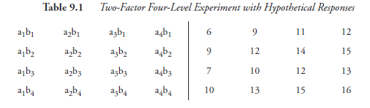 Table 9.1 lists the corresponding values of the dependent variable, alongside the level combinations of the two factors a and b.