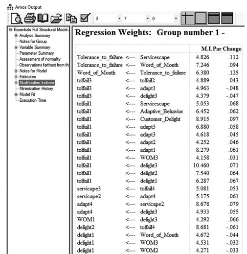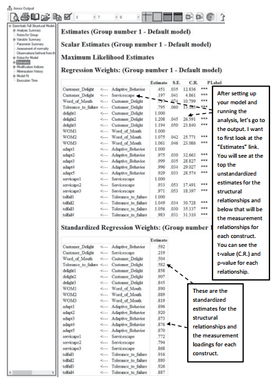 The overall results of the full structural model show that the relationships from Adaptive Behavior and Servicescape to Customer Delight were significant. Additionally, the relation- ships from Customer Delight to PositiveWord of Mouth and Tolerance to Future Failures were also significant. If you compare the results from the path model to the full structural model, you will see that all the structural relationships are stronger in the full structural model, and this is a function of explaining more of the variance in the model with the indicators included. This is also reflected with the stronger model fit indices for the full structural model over the path model. Overall, a full structural model will provide a stronger test in assessing relation- ships between constructs than using a path model.