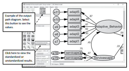 One function not yet discussed is the “View Output Path Diagram” function. After you run your analysis, you can go back to the graphics window and view the standardized or unstand- ardized results for every path on the actual diagram. The view output path diagram function is what will display these values on the model.This function is located at the top of the graph-