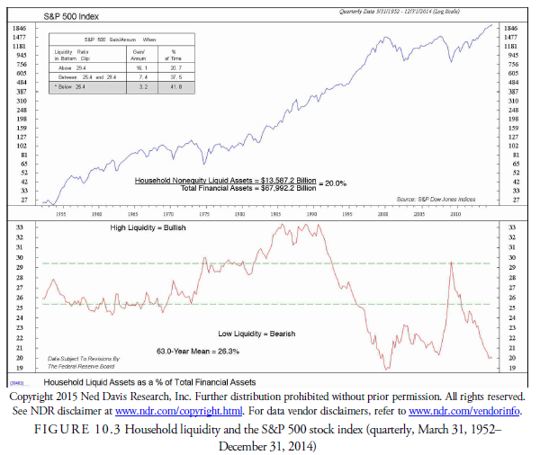 The data presented in Figure 10.3 from Ned Davis Research, Inc. shows a substantial decline in household liquidity in the 1990s and more recently since 2010. This is one reason why consumer debt has risen so strongly and why households are unable to withstand a severe economic contraction. During a severe economic contraction, one major source of funds for cash-strapped households is the stock market. Thus, this indicator, although it does not give mechanical signals, does measure the potential funds for stock demand or supply.