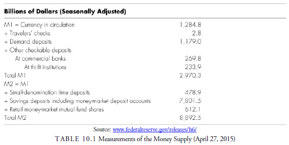 The Federal Reserve measures money supply in a number of ways. Table 10.1 shows the various measurements of money that the Federal Reserve uses. The categories are based on liquidity, or the ease in which the financial assets can be converted into cash.