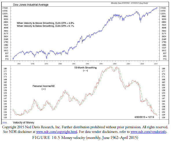 The velocity of money is a measure of how fast money turns over in the economy. It is calculated as a ratio of personal income to M2 (or sometimes GDP to M2). Money velocity is related to inflation; the faster money circulates, the more pressure that exists on prices, and the more it serves as a leading indicator of longterm interest rates, again because it reflects inflationary pressure. In terms of being an indicator for the stock market, Ned Davis Research, Inc. found that when money velocity (a monthly figure) rises above its 13- month moving average, the stock market has advanced 4.8% per annum on average. When money velocity declined below its 13-month moving average, the stock market advanced 9.1% per annum. This relationship is shown in Figure 10.5. Clearly, inflationary pressures from increased money velocity put a damper on stock market prices.