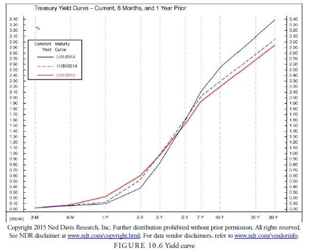 The yield curve is a graphical representation of the yield on bonds with various lengths of time to maturity. The yield curve changes over time as short- and long-term interest rates change due to Federal Reserve action or the marketplace. Figure 10.6 shows the 3-month to 30-year yield curve at three different dates (May 31, 2014, November 30, 2014, and May 31, 2015) to display how the curve can change over a year’s time. Yield curve information is also summarized as a ratio or difference between a short-term and longterm interest rate over time. Figure 10.7 shows the difference between the long-term Treasury bond yield and the three-month Treasury bill rate from September 1964 through May 2015.
