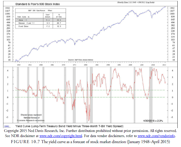 This inverted yield curve usually has dire consequences for the economy because it curtails the incentive of banks and other lending institutions that borrow money at short-term rates to make loans at long-term rates. The Federal Reserve estimates that an inverted yield curve predicts recessions two to six quarters ahead. Figure 10.7 shows the history of the yield curve and how it tends to forecast the direction of the stock market. Ned Davis Research found that when the long-rates advanced 1.1 percentage points above the short-rates, the stock market advanced 11.4% per annum on average. Contrarily, when the yield curve inverted, the stock market declined on average 7.2% per annum.
