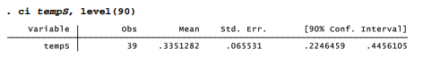 The robust mean is slightly lower than the ordinary mean (.319 versus .335), and the .5 quantile (.28) is lower than either — suggesting that a few warm years are pulling the mean up. In any of these commands, the level( ) option specifies the desired degree of confidence. If we omit this option, Stata automatically displays a 95% confidence interval.