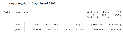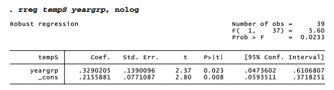 Is that conclusion robust? rreg finds that the robust means differ even more, by .329 °C. That difference too is significant (p = .023).