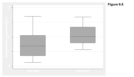 To compare two means, analysts typically employ a two-sample t test (ttest) or one-way analysis of variance (oneway or anova). As seen earlier, we can perform equivalent tests (yielding identical t and F statistics) by regressing the measurement variable on a dummy variable. The dummy variable yeargrp, coded 0 for years 1972-1999 and 1 for years 2000-2011, provides an illustration. Figure 8.8 graphs temperature anomalies for these two groups of years.
