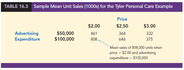 To provide an illustration of interaction and what it means, let us review the regression study conducted by Tyler Personal Care for one of its new shampoo products. Two factors believed to have the most influence on sales are unit selling price and advertising expenditure. To investigate the effects of these two variables on sales, prices of $2.00, $2.50, and $3.00 were paired with advertising expenditures of $50,000 and $100,000 in 24 test markets. The unit sales (in thousands) that were observed are reported in Table 16.2.