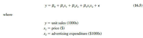 Note that equation (16.5) reflects Tyler’s belief that the number of units sold depends linearly on selling price and advertising expenditure (accounted for by the β1x1 and β2x 2 terms), and that there is interaction between the two variables (accounted for by the β3x1x2 term).
