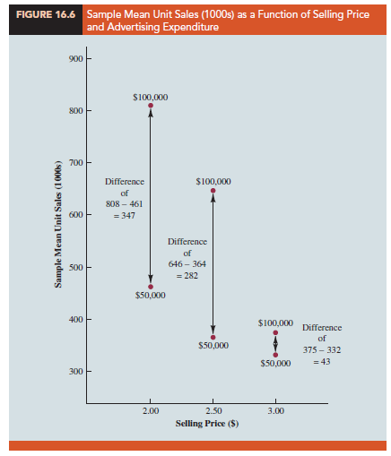 Table 16.3 is a summary of these data. Note that the sample mean sales corresponding to a price of $2.00 and an advertising expenditure of $50,000 is 461,000, and the sample mean sales corresponding to a price of $2.00 and an advertising expenditure of $100,000 is 808,000. Hence, with price held constant at $2.00, the difference in the sample mean sales between advertising expenditures of $50,000 and $100,000 is 808,000 – 461,000 = 347,000 units. When the price of the product is $2.50, the difference in the sample mean sales is 646,000 – 364,000 = 282,000 units. Finally, when the price is $3.00, the difference in the sample mean sales is 375,000 – 332,000 = 43,000 units. Clearly, the difference in the sample mean sales between advertising expenditures of $50,000 and $100,000 depends on the price of the product. In other words, at higher selling prices, the effect of increased advertising expenditure diminishes. These observations provide evidence of interaction between the price and advertising expenditure variables.