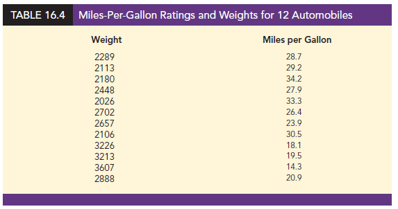 In showing how the general linear model can be used to model a variety of possible relationships between the independent variables and the dependent variable, we have focused attention on transformations involving one or more of the independent variables. Often it is worthwhile to consider transformations involving the dependent variable y. As an illustration of when we might want to transform the dependent variable, consider the data in Table 16.4, which shows the miles-per-gallon ratings and weights for 12 automobiles. The scatter diagram in Figure 16.8 indicates a negative linear relationship between these two variables. Therefore, we use a simple first-order model to relate the two variables. The output is shown in Figure 16.9; the resulting estimated regression equation is