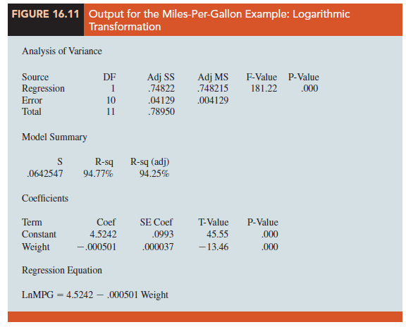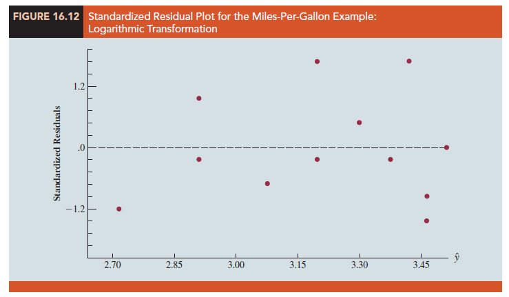 Often the problem of nonconstant variance can be corrected by transforming the dependent variable to a different scale. For instance, if we work with the logarithm of the dependent variable instead of the original dependent variable, the effect will be to compress the values of the dependent variable and thus diminish the effects of nonconstant variance. Most statistical packages provide the ability to apply logarithmic transformations using either the base 10 (common logarithm, log10) or the base e = 2.71828 (natural logarithm, ln). We applied a natural logarithmic transformation to the miles- per-gallon data and developed the estimated regression equation relating weight to the natural logarithm of miles-per-gallon. The regression results obtained by using the natural logarithm of miles-per-gallon as the dependent variable, labeled LnMPG in the output, are shown in Figure 16.11; Figure 16.12 is the corresponding standardized residual plot.