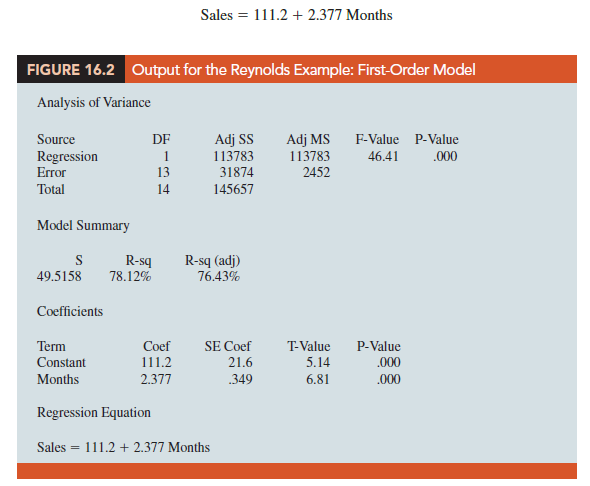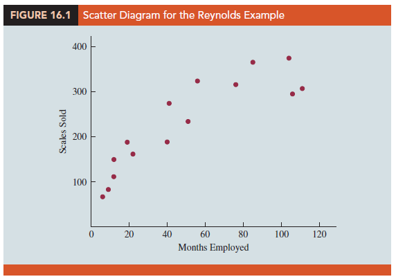 More complex types of relationships can be modeled with equation (16.1). To illustrate, let us consider the problem facing Reynolds, Inc., a manufacturer of industrial scales and laboratory equipment. Managers at Reynolds want to investigate the relationship between length of employment of their salespeople and the number of electronic laboratory scales sold. Table 16.1 gives the number of scales sold by 15 randomly selected salespeople for the most recent sales period and the number of months each salesperson has been employed by the firm. Figure 16.1 is the scatter diagram for these data. The scatter diagram indicates a possible curvilinear relationship between the length of time employed and the number of units sold. Before considering how to develop a curvilinear relationship for Reynolds, let us consider the output in Figure 16.2 corresponding to a simple first-order model; the estimated regression is
