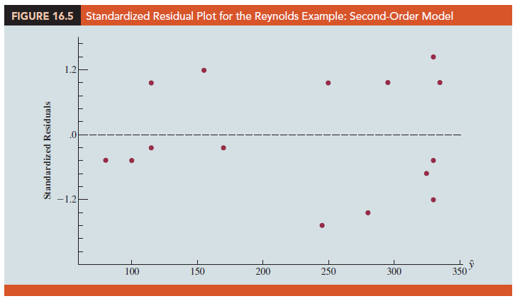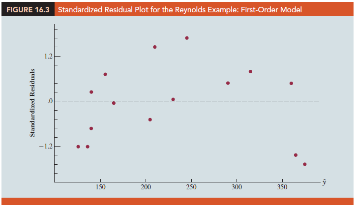 Figure 16.3 is the corresponding standardized residual plot. Although the computer output shows that the relationship is significant (p-value = .000) and that a linear relationship explains a high percentage of the variability in sales (R-sq = 78.12%), the standardized residual plot suggests that a curvilinear relationship is needed.