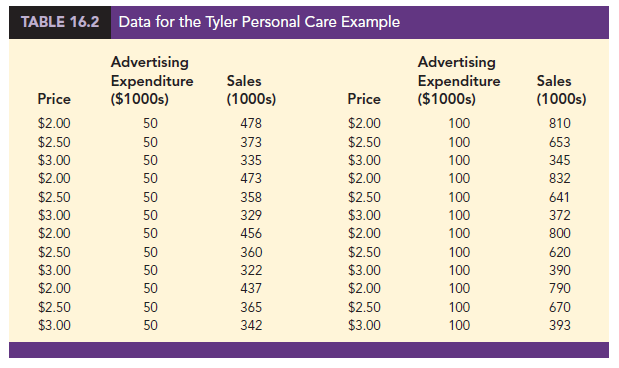 To provide an illustration of interaction and what it means, let us review the regression study conducted by Tyler Personal Care for one of its new shampoo products. Two factors believed to have the most influence on sales are unit selling price and advertising expenditure. To investigate the effects of these two variables on sales, prices of $2.00, $2.50, and $3.00 were paired with advertising expenditures of $50,000 and $100,000 in 24 test markets. The unit sales (in thousands) that were observed are reported in Table 16.2.
