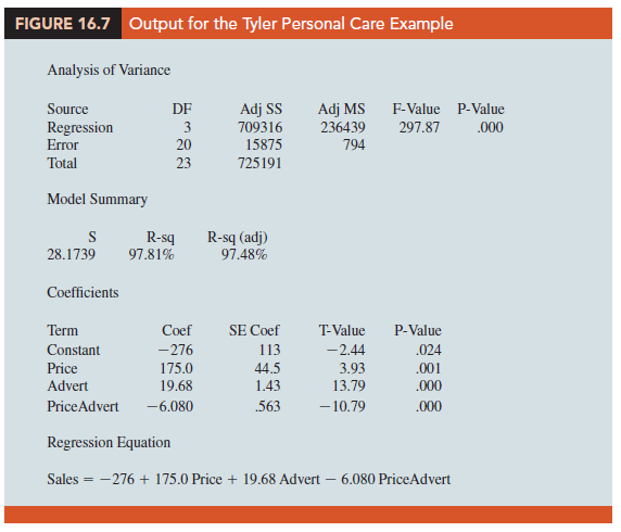 Figure 16.7 is the output corresponding to the interaction model for the Tyler Personal Care example. The resulting estimated regression equation is